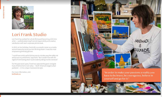Lori Frank is an independent artist from Edmonton, Alberta, Canada, with over 30 of painting experience. In 2013, she fulfilled her lifelong dream of pursuing her art full-time and jumped into creative world with both feet. Lori specializes in acrylics and oils, creating uplifting, colorful, and unique pieces. Her works have been showcased at Edmonton City Hall, Muttart Conservatory, and the Jubilee Auditorium. For 10 years, she has focused on painting Edmonton's river valley and developing her Canadiana series. In September 2018, her night cityscape, "Reflections of Light," was selected by a jury to featured by EEDC in the second publication of "Gifted," which highlights handmade items from Edmonton Made. Additionally, her painting of the rail car crossing High Level Bridge, "Riding the Rails," was included in the Gifted catalogue in September 2019. She primarily uses acrylics to develop her Edmonton river valley series. Although she began her artistic journey with watercolors, she found acrylics to be more flexible for her unique impressionism style. Oils, Pastels, charcoal, and pencil drawing are other mediums she plans to explore again. An avid photographer, Lori captures reference material for her paintings focusing on important subjects and themes. Her distinctive painting style emerged organically during her teenage years while taking art classes. Her work has been described as "dancing with light" by 4 City Councillor and artist Aaron Paquette, who notes "your eye sort of flicks across from highlight to. It's a joy." Lori believes that it's crucial for individuals, cultures, neighbors and cities to see themselves reflected in culture and art. She aims to deepen our sense of identity and belonging through her work, stating, "It feels good to know someone recognizes the same beauty in surroundings that you do, and maybe sometimes, they uncover something new." (Excerpt from an article in Edmonton Prime Times, Dec 2, 2019). For several years, her muse has been the Edmonton river, North America's largest urban parkland. During this time, she conceived and developed her "Stairway to Heaven," "Trailblazing," and "Connector" series, continuing to create new in these themes. Through her ongoing series, Lori hopes to inspire Edmontonians and tourists to explore the city and valley firsthand fostering a deeper connection with the area. Each new painting involves an adventure into the valley to discover locations to capture and translate into her artwork. Having spent thousands of hours photographing the well-known and unique hiking trails, stairways, and bridges; then Lori breathes new life into them with her paintings. To date, she has painted over 70 pieces of the Edmonton valley and feels like she is just getting started. She is also expanding her series to include urban trails above the valley festivals, activities, and parks. In 2022 she started her night series featuring iconic Edmonton spots. Lori is grateful to paint her city and valley, considering her work a historical representation of our time. In winter 2014, Lori was interviewed, and her art was featured in a segment by Dez Melenka "On Your Street" on CTV Edmonton. She has also appeared on TV, Global TV, and was featured in the Edmonton Journal and on Capital FM. Her exhibits in 2014 included the unveiling of her river valley series at City Hall for a solo show during The Works Art and Design Festival. She was selected for a group exhibit by the River Valley Alliance and Visual Arts Alberta titled "Marking the Valley," held at the Northern and Southern Alberta Jubilee Auditoriums. In December, she showcased her "Stairway to Heaven" in a solo exhibit at the Milner Gallery. From 2014 to 2018, she held a pop-up gallery the outdoor city market. In January 2014, the City of Edmonton invited her to display her river valley art at the Winter Cities conference at the Shaw Conference Centre. that March, Lori appeared on City TV to an upcoming show with the Night of Artists at the Enjoy Centre. In July, she participated in the Artwalk on Whyte Avenue for the second time and took part in an art show during the Taste of Edmonton outside the Winspear. In August 2015, the Daffodil Gallery selected her for a carry-over exhibit from her display at Artwalk. In April 2016, a feature produced by Madelaine Skinner of NAIT's Broadcasting School aired on CTV2, highlighting the importance of managing art business in today's economy. In July 2016, "Where Edmonton" magazine listed Lori's Edmonton river valley art as a top selection to "take a piece of the city home with you" in Made in Edmonton article by Lindsay Shapka In September, the "Riverdalian" newspaper featured her painting of the Cloverdale Footbridge. On November 30, 2016, the Edmonton Journal showcased Lori's art and greeting in their holiday gift guide. From April to May 5, 2017, she held a solo art show "Valley Girl" at the Muttart Conservatory. July 5, Lori was interviewed by Bridget Ryan at the request of the Artwalk organizer to help promote the upcoming event. Until May 23, 8, she participated in the "VOTE FOR YOUR TOTE" fundraiser for the United Way, supporting those living in poverty. Thank you to everyone who voted for tote and for visiting it at the Premium Outlet Collection at International Airport—it won! On December 2, 2019, Edmonton Prime Times featured a full-page spotlight on Lori, and her artist spotlight was published Where magazine in January 2020. In 2020, Lori's new paintings of the Walterdale Bridge and Snowbird were featured in a newsletter by the Edmonton Arts Council, and a beautifully written article about her art was published in Edify Magazine. Lori's gratitude and dreams continue as she has now also embarked on her night of Edmonton. Her works are in private collections across Canada, the United States,, Australia, and New Zealand. Lori welcomes of any suitable subject matter. Inspired by nature and travel, she is always seeking beauty and inspiration in ever
